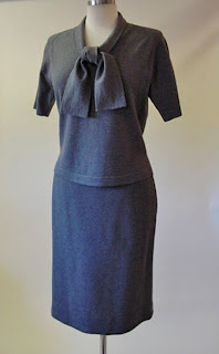 This wiggle dress from Lord and Taylor was found on Ebay. Sporting matching bow details at the neck and waist, sadly the seller tells us little about the dress. I would estimate the size to be an 8 or 10, as the waist measures 28" easily and stretches to 30". The dress is available for a Buy It Now price of $29.95 - a price so low for a wiggle dress of this vintage, I'd consider it a good gamble given the vacuum of information about fabric or condition.
